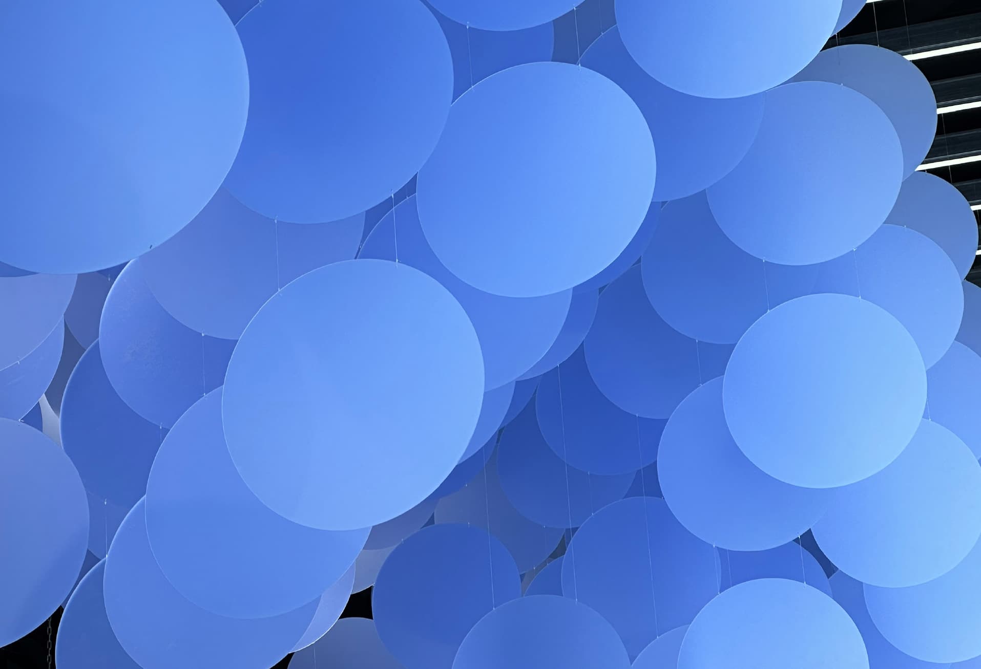 Custom-made double-sided frosted acrylic panels are cut by a high-speed engraving machine and equipped with transparent wires in each hanging module.