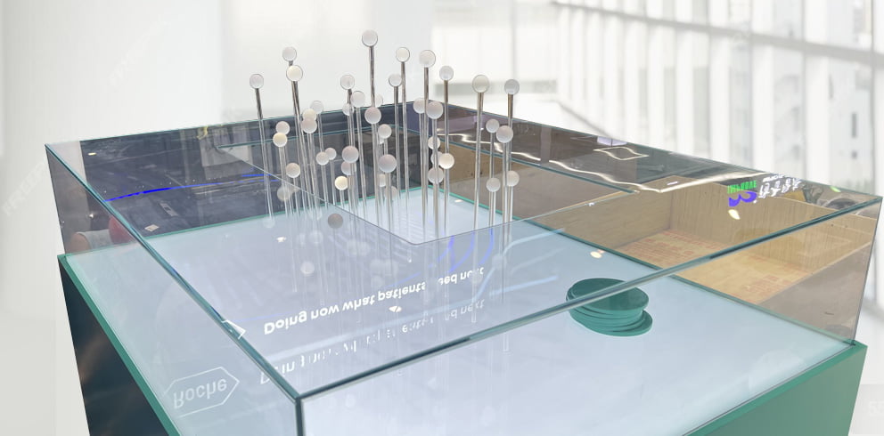 The half-open glass cover allows visitors to vary the placement of the exhibits.